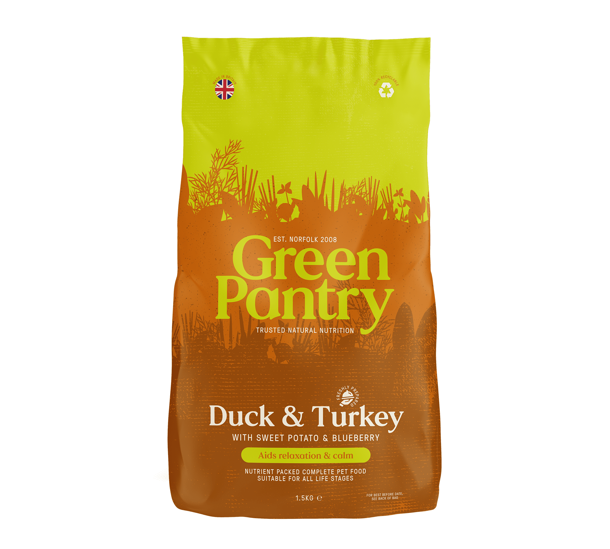 Introducing Green Pantry’s Duck with sweet potato and blueberry, dog food and puppy food. – This 100% natural product is carefully crafted to taste great and help to aid the onset of natural calm and relaxation in pets. Treat your dog or puppy to serenity with our delicious, hypoallergenic, natural nutrition.