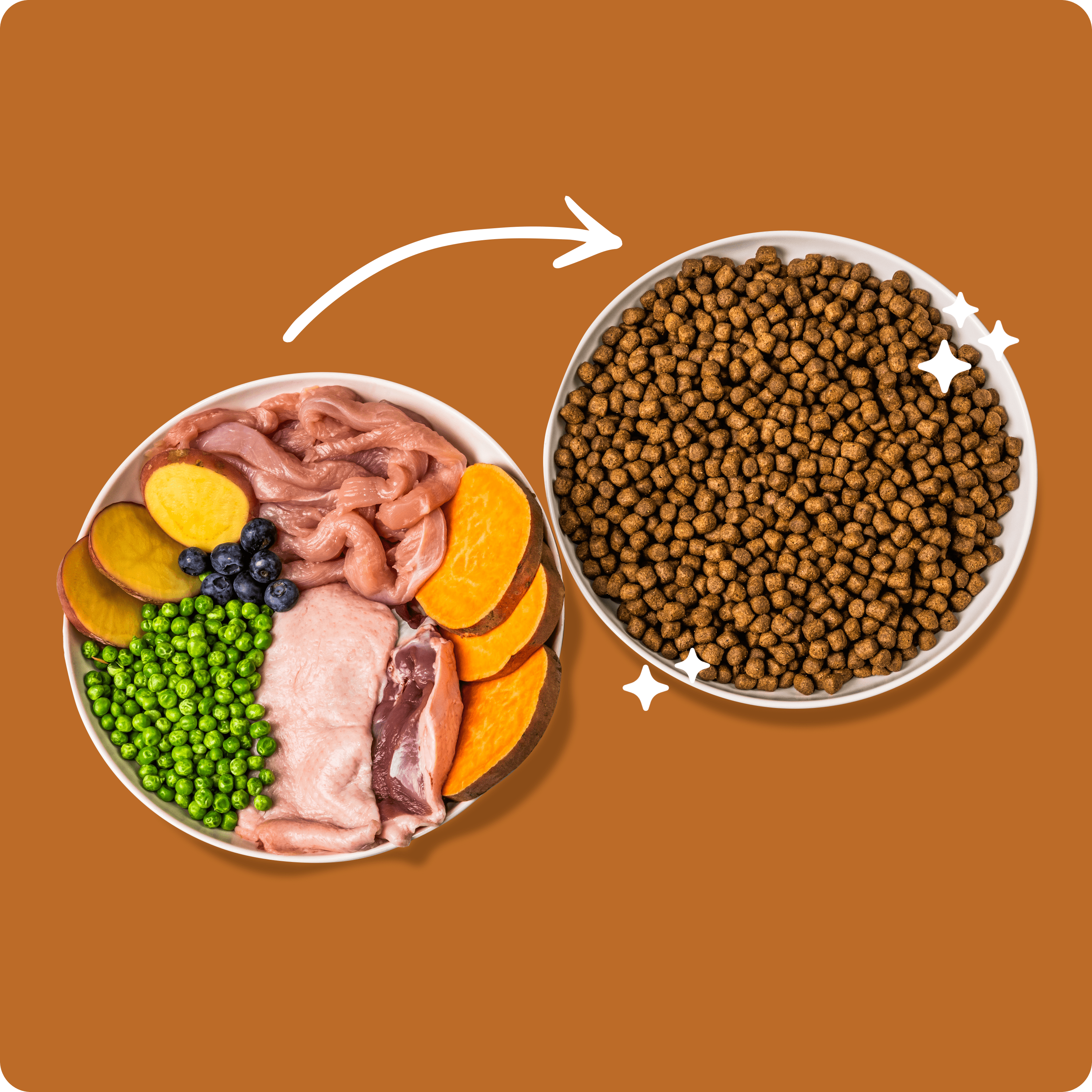 Composition: Duck and Turkey 57% (Freshly Prepared Duck (21.5%), Freshly Prepared Turkey (21.5%), Dried Duck (6%), Dried Turkey (6%) Duck Stock (1.5%), Turkey Fat (0.5%) Sweet Potato (12%), Peas (12.5%), Potato (12.5%).