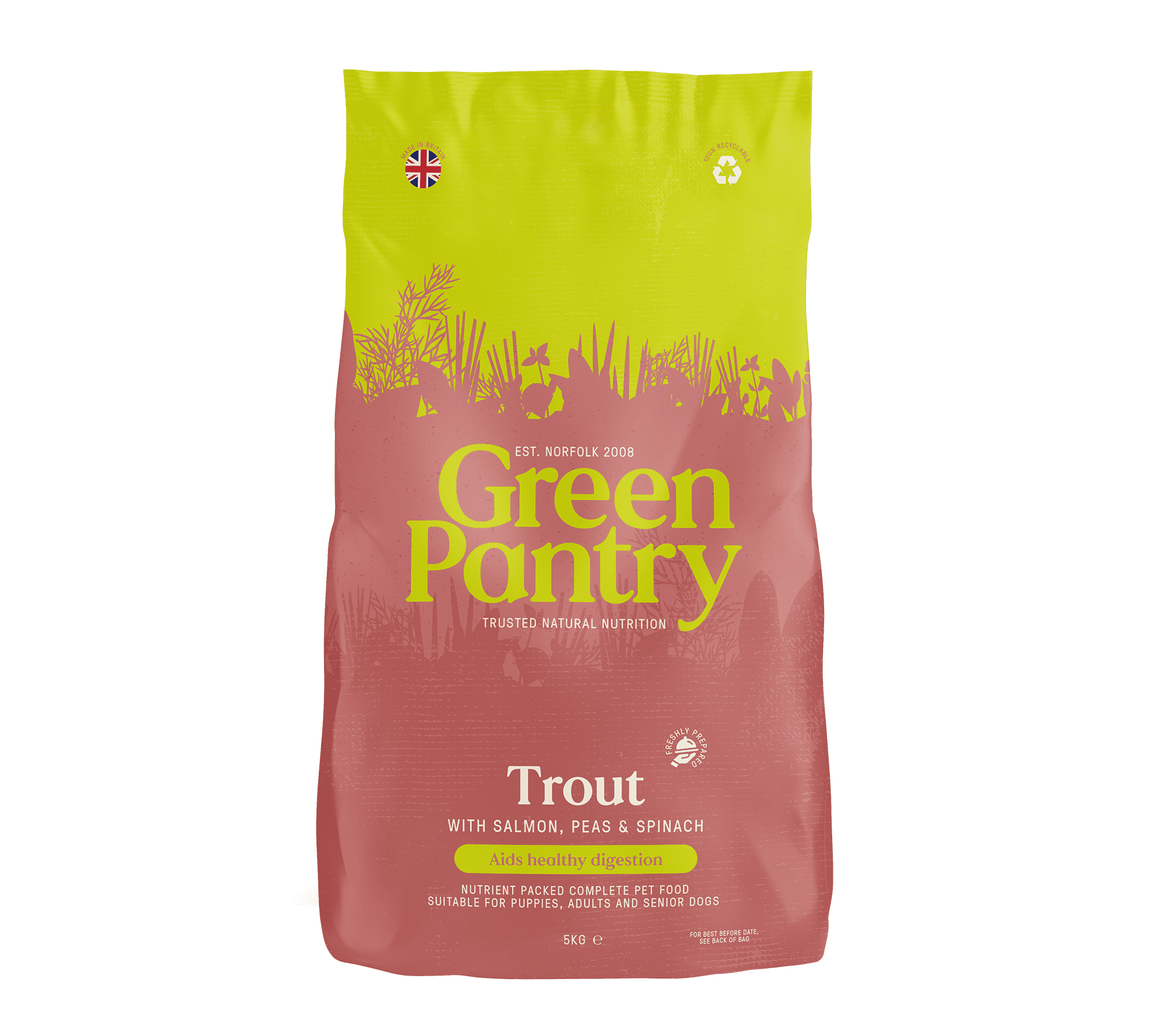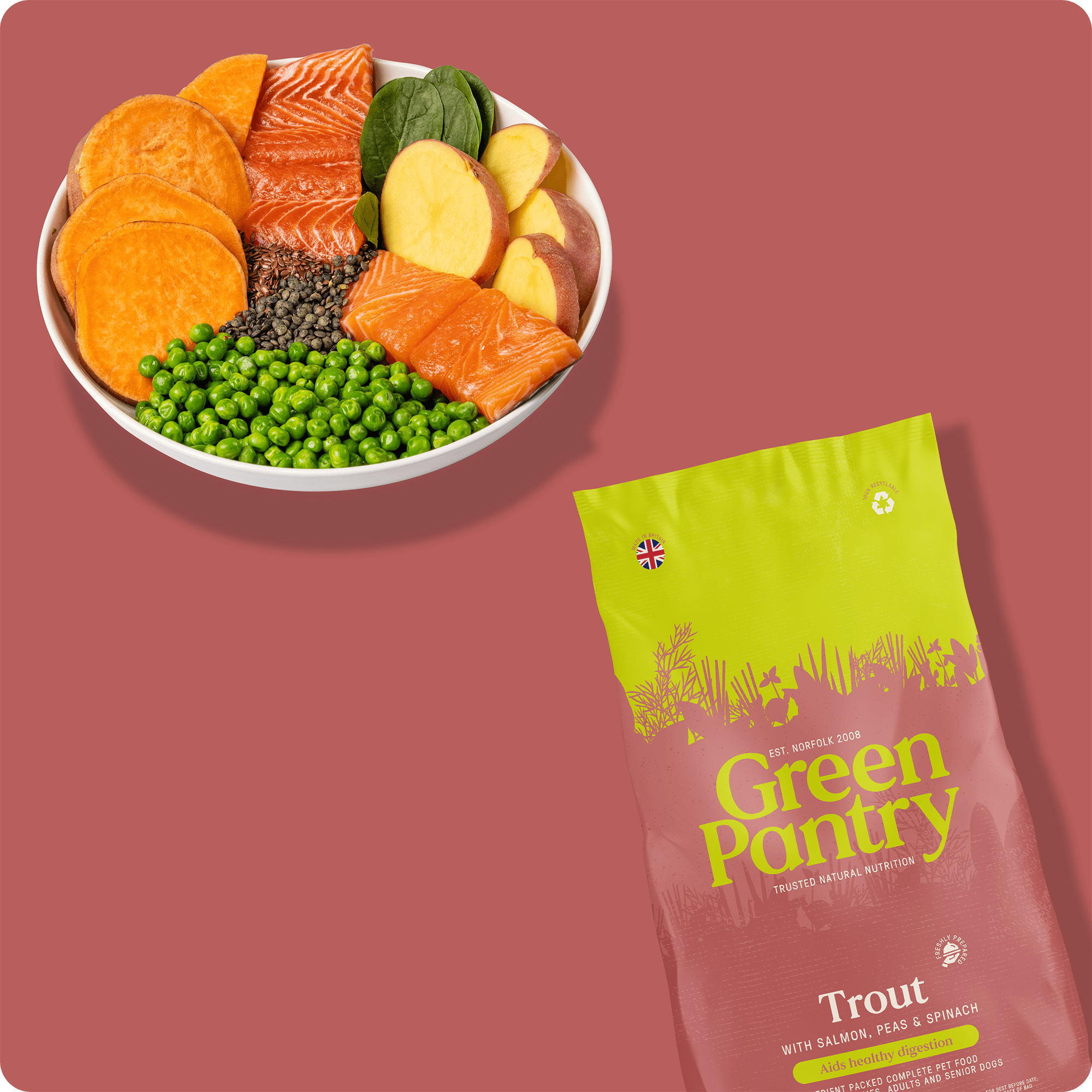 Transform your dog’s or puppy’s health and happiness with Green Pantry’s 100% Natural Trout and Salmon hypoallergenic dog food. This gentle dog food with fish is particularly suitable for supporting dogs with digestive health struggles or food allergies. It also acts as a naturally low-fat dog food or puppy food.